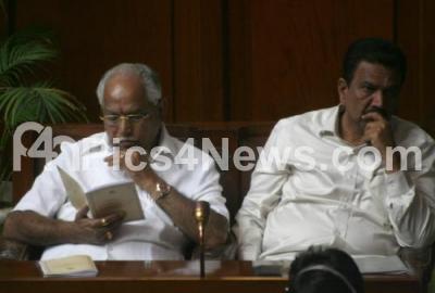 Photo Caption : Former Chief Minister BS Yediyurappa with Minister CC Patil during Governor HR Bhardwaj address to Joint Session of Legislation at Assembly Hall in Vidhana Soudha, in Bangalore on Monday 30th January 2012