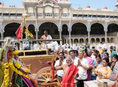 Photo Caption : Rathasapthami Pooja of all temples being performed at Mysore Palace, in Mysore on Monday 30th January 2012