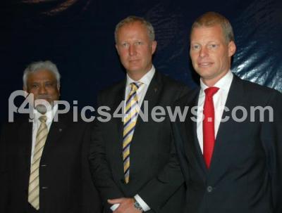Photo Caption : Henrik Fagrenius, MD, Scania Commercial Vehicles India Pvt Ltd with Kirster Thulin, Marketing Director Buses and Coaches and Suresh Ekambaram, Director, After Sales seen during a press conference to announce setting up of new manufacturing facility of Scania Commercial Vehicles in Bangalore, press conference held at Hotel Lalit Ashok, in Bangalore on Tuesday 31st January 2012