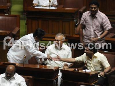 Photo Caption : JDS MLA Zameer Ahmed with MLA Ramalingareddy and others seen during Assembly Session in Vidhana Soudha also seen in Bangalore on Tuesday 31st January 2012
