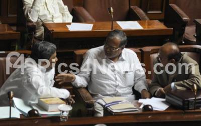 Photo Caption : Opposition Leader Siddaramaiah seen interacting with Minister S Suresh Kumar during Assembly Session in Vidhana Soudha also seen MLA Jayachandra, in Bangalore on Tuesday 31st January 2012