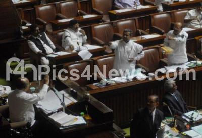 Photo Caption : Opposition Leader Siddaramaiah seen with black band on his left arm, demanding the resignation of Speaker Boppaiah during Assembly Session in Vidhana Soudha, also seen Deputy Speaker Yogesh Bhat , in Bangalore on Wednesday 1st February 2012