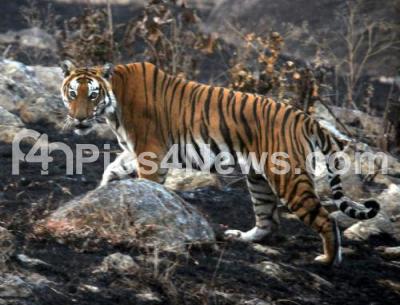 Photo Caption : A tiger spotted in bandipur forest area, tigers are regularly spotted in bandipur forest due to dry season in the forest area on Wednesday 1st February 2012