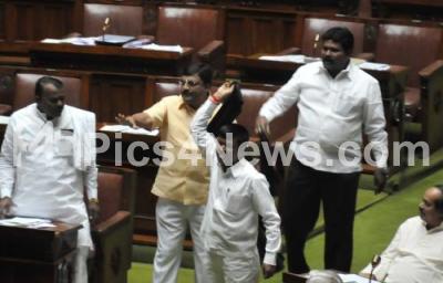 Photo Caption : Independent MLAs Goolihatti Shekhar, P Narendraswamy and others seen waving black flags during their protest against Speaker KG Bopaiah during Assembly Session at Vidhana Soudha, in Bangalore on Thursday 2nd February 2012