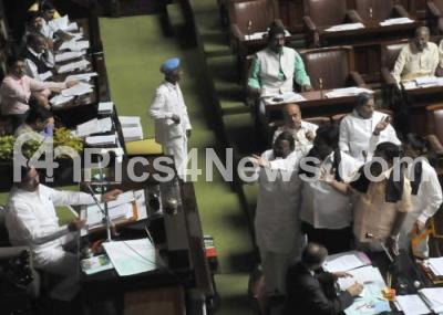 Photo Caption : Independent MLAs Goolihatti Shekhar, P Narendraswamy and others seen protesting against Speaker KG Bopaiah during Assembly Session at Vidhana Soudha, in Bangalore on Thursday 2nd February 2012