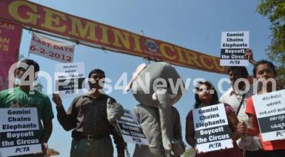 Photo Caption : PETA activist wearing an elephant costume and in shackles being escorted by another PETA activists during their protest asking the parents and children to boycott the circus where elephants and other animals are forced to perform in circuses, the protest was held outside the gates of Gemini Circus at Palace grounds, in Bangalore on Friday 3rd January 2012
