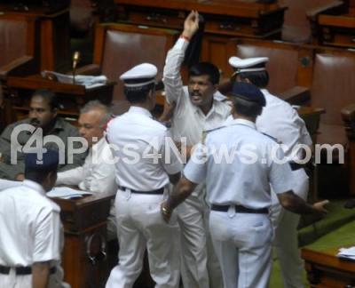 Photo Caption : Independent MLA Goolihatti Shekhar being taken away by marshals after he made a remark against Speaker KG Bopaiah during of Assembly Session at Vidhana Soudha, in Bangalore on Friday 3rd February 2012