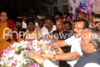 Photo Caption : Chief Minister DV Sadananda Gowda with BJP State President KS Eshwarappa seen paying their final respects to actor Karibasavaiah who died yesterday, body was kept at Ravindra Kalakshetra for public viewing, in Bangalore on Saturday 4th February 2012
