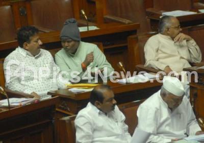 Photo Caption : Former Minister Katta Subramanya Naidu seen interacting with MLA Vishwanath during Assembly Session at Vidhana Soudha, in Bangalore on Monday 6th February 2012