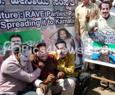 Event Description : Bangalore City District Congress Committee members protesting against the BJP Government in Karnataka and the three BJP Ministers Lakshman Savadi, CC Patil and Krishna Palemar, who were caught watching porn video on a cell phone in the Karnataka State Assembly yesterday, a play was mocked, like the three BJP Ministers watching a porn video on cell and posters with skimpily dressed and masks of the three tainted BJP Ministers and BJP leaders were on display during a protest at Gandhi Statue at Anand Rao Circle, in Bangalore on Wednesday 8th February 2012