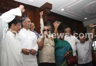 Photo Caption : Opposition MLCs seen protesting against tainted BJP Ministers at Council lounge at Vidhana Soudha, in Bangalore on Wednesday 8th February 2012