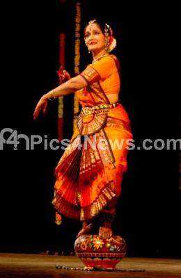 Photo Caption : Dancer Uma Itagi performing Bharatanatyam on a mud pot during the Shrishti National Festival of Music and Dance at Ravindra Kalakshetra photos, in Bangalore on Wednesday 8th February 2012