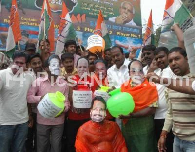 Members of the Youth Congress seen holding mock demonstration of cleansing BJP Ministers with Gangajal during their protest against three tainted former BJP Ministers and against BJP Govt, protest held at Gandhi Statue Anand Rao Circle, in Bangalore on Saturday 11th February 2012