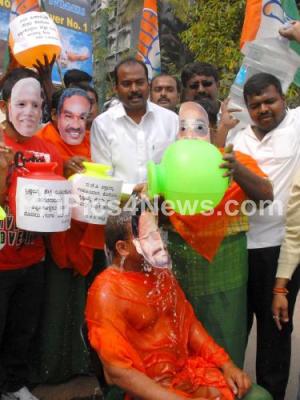 Photo Caption : Members of the Youth Congress seen holding mock demonstration of cleansing BJP Ministers with Gangajal during their protest against three tainted former BJP Ministers and against BJP Govt, protest held at Gandhi Statue Anand Rao Circle, in Bangalore on Saturday 11th February 2012