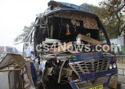 Photo Caption : Private Bus from Chikkaballapur seen damaged after the bus rammed into road divider on Palace Road near Central College, in Bangalore on Saturday 11th February 2012