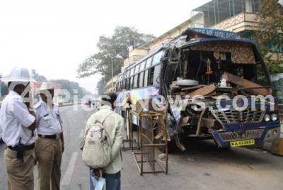 Photo Caption : Private Bus from Chikkaballapur seen damaged after the bus rammed into road divider on Palace Road near Central College, in Bangalore on Saturday 11th February 2012