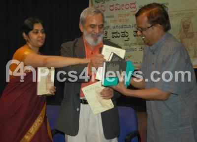 Photo Caption : Dr UR Ananthmurthy with Prof OL Nagabhushana Swamy and poet JaNa Tejashree seen releasing Dr UR Ananthmurthy's "Kavi Ravindra" and "Pragne Mattu Parisara" books during a book release programme at Indian Institute of World Culture organised by Ankitha Pustaka, in Bangalore on Sunday 12th February 2012