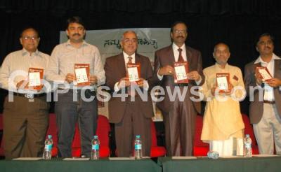 Photo Caption : Kumar Nayak, IAS, Principle Secretary, Education Dept with Prof Malleshwaram G Venkatesh, Vice Chancellor, Sanskrit University, MR Srinivas Murthy, IAS and others seen releasing "Shikshaka Vruttiya Saarthaka Badaku" book during a book release programme at NMKRV College Jayanagar organised by Samrudha Sahithya, in Bangalore on Sunday 12th February 2012