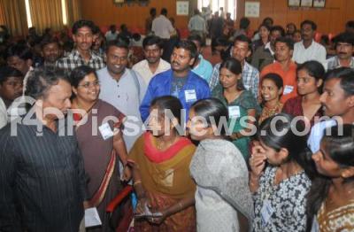 Photo Caption : Noted writer and activist Barguru Ramachandrappa and CITU Secretary State Committee Varalakshmi interacting with teachers during the inauguration of state conference on Government Computer Teachers at NGO Hall, in Bangalore on Sunday 12th February 2012