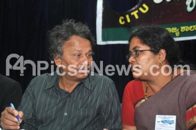 Photo Caption : Noted writer and activist Barguru Ramachandrappa and CITU Secretary State Committee Varalakshmi seen during the inauguration of state conference on Government Computer Teachers at NGO Hall, in Bangalore on Sunday 12th February 2012