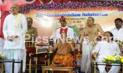 Photo Caption : Tamil Nadu Governor Rosaiah seen addressing during Sri Nagareshwara Kanyakaparameshwari temple Maha Kumbhabishekam Mahotsava at Shivaji Nagar also seen Swami Jayendra Saraswati, Shankaracharya of Kanchi Matham and MLA Roshan Baig, in Bangalore on Sunday 12th February 2012