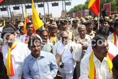 Photo Caption : Members of Federation of Karnataka State Lorry Owners and Agents Association led by its president Shanmugham seen protesting against Bangalore International Airport Road Toll collection, protest held at Airport Road Toll near Devanahalli, in Bangalore on Monday 13th February 2012