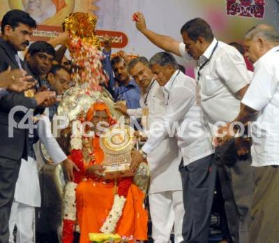 Photo Caption : Shri Shri Guruparadeshikendra Mahaswamiji being felicitated by Minister V Somanna MLC Veeranna Matti Katti and others during Shri Guru Siddarameshwara 839th Jayanthi celebration at Chowdaiah Memorial Hall, in Bangalore on Monday 13th February 2012