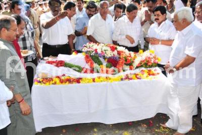 Photo Caption : Congress Leader RV Deshpande and others paying last respects to Dr VS Acharya who passed away after suddenly collapsing when he suffered a massive heart attack while attending a seminar programme at Government Science College on Nrupathunga Road, he was 71, in Bangalore on Tuesday 14th February 2012