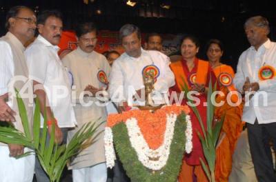 Photo Caption : Opposition Leader Siddaramaiah seen lighting the lamp to inaugurate Gaaniga Samajotsava, a programme to felicitate veterans and award ceremony for the achievers in various fields at Jnana Jyothi Auditorium also seen Former Council Chairman VR Sudarshan, former MP Tejaswani Ramesh and others, in Bangalore on Wednesday 15th February 2012