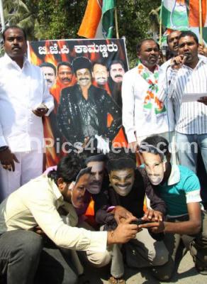 Members of Youth Congress wearing masks of BJP ministers seen protesting against tainted BJP Ministers, protest held at Gandhi Statue Anand Rao Circle, in Bangalore on Thursday 16th February 2012