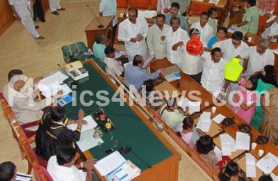 Photo Caption : Congress corporators led by BBMP Opposition Leader Uday Shankar seen protesting against non supplying of proper drinking water in DJ Halli areas before the start of BBMP Council Session also seen in the chair are Mayor Sharadamma, Deputy Mayor S Harish and BBMP Commissioner Shankarlinge Gowda, in Bangalore on Thursday 16th February 2012