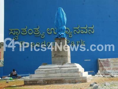Photo Caption : Bronze statue of Rashtrakavi Kuvempu seen wrapped at Freedom Park as it will be unveiled on 20th February Chief Minister DV Sadananda Gowda, in Bangalore on Thursday 16th February 2012
