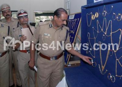Photo Caption : Jyothi Prakash Mirji, commissioner of Police inspecting the recovered stolen jewellery by the Bangalore East and North East Division police by crime detection squad worth rupees 65 Lakhs and apprehended 26 chain snatchers involved in the cases, the recovered valuables were being displayed at Police Commissioners office in Bangalore on Saturday 18th February 2012
