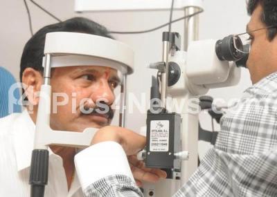 Photo Caption : CM DV Sadananda Gowda getting eyes checked at the Vasan Eye Care Centre which was inaugurated in Shimoga on Saturday 18th February 2012