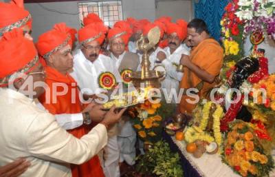 Photo Caption : Veerappa Moily, Union Minister for Corporate Affairs with Sri Sureshwarananda Bharathi Swamiji, Anil Lad, MP, Ranoji Rao Sathe, Shivaji Rao and Jadhav performing pooja on the occasion of the 385th Birth Anniversary of Chatrapathi Shivaji organised by Karnataka Kshatriya Maratha Parishat at Maratha Bhavan, in Bangalore on Sunday 19th February 2012