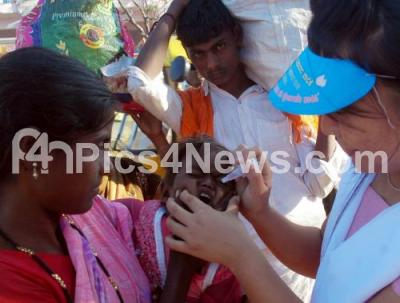 Photo Caption : A Volunteer administering a dose of Polio immunization to a child as part of the nation wide Pulse Polio Campaign at Kempegowda bus stand, in Bangalore on Sunday 19th February 2012