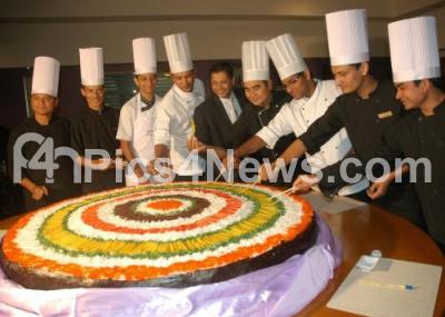 Photo Caption : Chef Sudhir Nair (third from right) and his team members of Ginseng Restaurant, Hotel Royal Orchid seen displaying World's largest Maki Sushi, a festive food of Japanese people, this Maki Sushi is 4 feet 7 inches in diameter and 6 inches in height and is set to enter into Limca Book of Records, in Bangalore on Tuesday 22nd February 2012