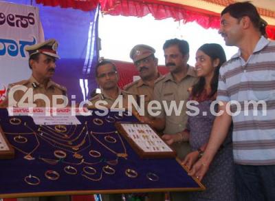 Photo Caption : Police Commissioner Jyothi Prakash Mirji seen returning back recovered jewellery other valuables to their owners during recovered property parade at Yelahanka, in Bangalore on Friday 24th February 2012