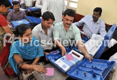Photo Caption : Elections officials making preparations and arranging EVMs (electronic voting machines) for Gandhinagar ward BBMP by poll at Corporation School in Gandhinagar, in Bangalore on Saturday 25th February 2012
