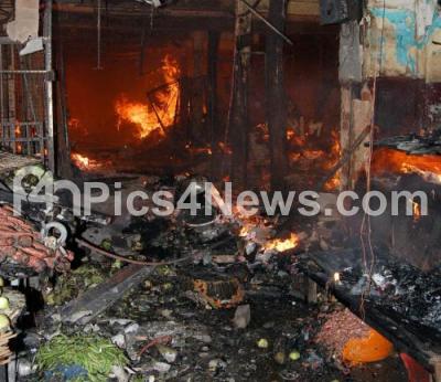 Photo Caption : Shops at Russell Market in Shivajinagar seen burning after fire caught in the market due to electric short circuit, in Bangalore on Saturday 25th February 2012