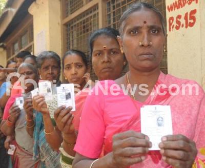 Event Description : People flashing their elections ID cards queue up to cast their vote during the Gandhinagar Ward BBMP by poll at Sheshadripuram, in Bangalore on 26th FEB 2012