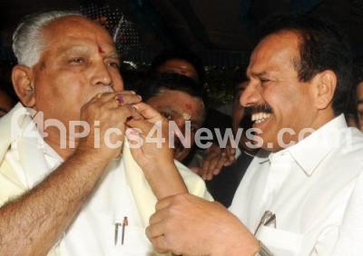 Photo Caption : CM DV Sadananda Gowda serving sweets to Former CM and Senior Karnataka BJP Leader BS Yediyurappa on his birthday at his residence at Race Course Road, Yediyurappa celebrated his 70th Birthday, in Bangalore on Monday 27th February 2012