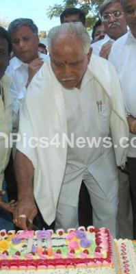 Photo Caption : Former CM and Senior Karnataka BJP Leader BS Yediyurappa being greeted cutting his birthday cake on his 70th Birthday Celebration at his residence at Race Course Road, in Bangalore on Monday 27th February 2012