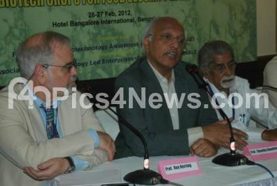 Photo Caption : Dr Shanthu Shantaram, President, FBAE with Prof Ron Herring, Cornell University, USA, Prof C Kameshwara Rao, Executive Secretary, FBAE and Dr B Sesikeran, Director, NIN, Hyderabad addressing a press conference and Biotechnology awareness and education programme of BLE, Association of Biotechnology Led Enterprises at Hotel Bangalore International, in Bangalore on Monday 27th February 2012