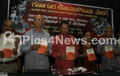 Dr Rev Father Manohar Chandraprasad with AK Subbaiah, Baragur Ramachandrappa, Gowri Lankesh and Suresh Bhat Baakrabylu, author releasing the book “Kesari Bhayoutpadane” on Gujarat Riots during a seminar on Gujarath Riots at Senate Hall, organised by Karnataka Komu Soharda Vedike, in Bangalore on Tuesday 28th February 2012