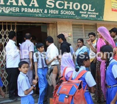 Photo Caption : Parents rushed to pick up their children from Sri Vinayaka School at Bennappa Park after the news of food poisoning of the students broke out, the food poisoning was caused due to the chocolates which were distributed by a student on his birthday and which caused many students of food poisoning and were admitted at Vani Vilas hospital, in Bangalore on Thursday 1st March 2012