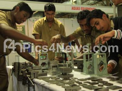 Photo Caption : Students seen at the stalls of mechanical equipments in manufacturing industry at CNC Expo 2012 which was inaugurated today at Palace Grounds, in Bangalore on Thursday 1st March 2012