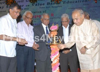 Photo Caption : Justice Rama Jois with Dr NR Shetty, Former Vice Chancellor, Bangalore University, Dr B Seshadri, Prof LM Patnaik and Prof N Rudraiah inaugurating the one day seminar on “ Value Based Education†at Town Hall, in Bangalore on Thursday 1st March 2012