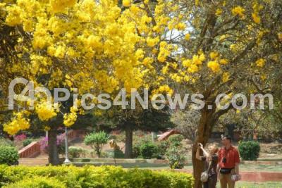 Flowers in full bloom as it captures the attention of the couple visitors at Cubbon Park, in Bangalore on Thursday 1st March 2012