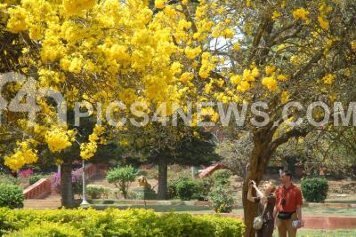 Photo Caption : Flowers in full bloom as it captures the attention of the couple visitors at Cubbon Park, in Bangalore on Thursday 1st March 2012
